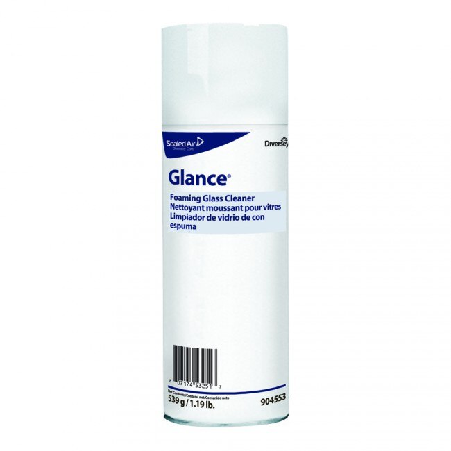Foaming Glance Cleaner. Non-streaking, quick-drying, ammoniated glass cleaner. Cleans and shines glass, mirrors, sinks, countertops, stainless steel and many other washable surfaces. Cuts through grease, grime, soap films, finger marks and smoke films. Ready-to-use formulation delivers excellent cleaning performance. Blue in color with an ammonia scent.